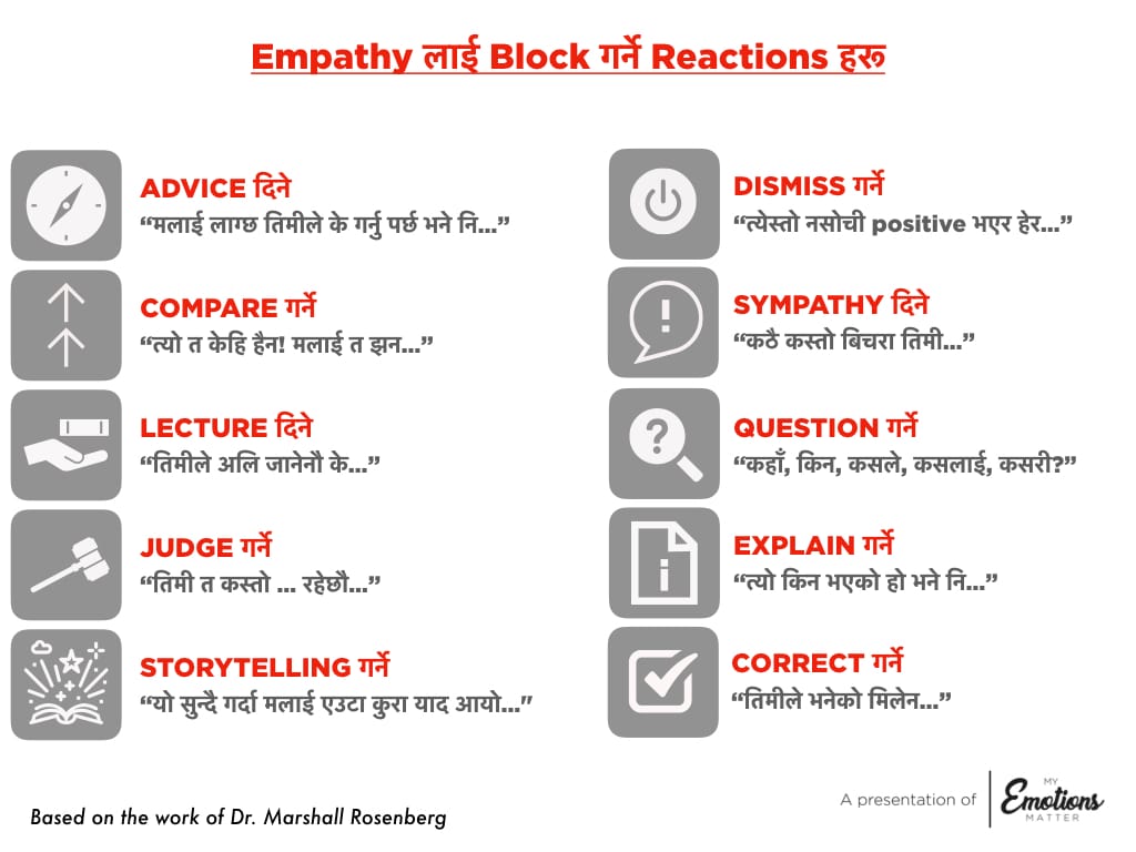 Holley Humphrey- a trainer for empathic communication, recognized some common behaviors that prevent us from connecting with others in an empathetic way.