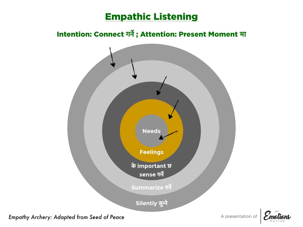 Empathy Archery is counterintuitive to how we usually approach people when it comes to empathizing with them (advising, consoling, dismissing feelings, encouraging them to feel pleasant, etc.). It helps us comprehend people's situations, understand what matters to them, and sense their feelings and underlying needs. It helps us 'connect' with people instead of/before finding ways to 'correct' them or their situation—which is what we need to exercise empathy and build meaningful connections.